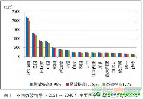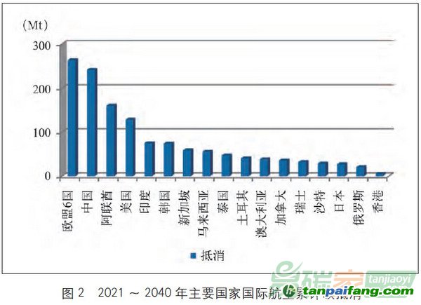 不同燃效情景下2021~2040年主要國(guó)家國(guó)際航空累計(jì)碳排放,如圖1所示,其中美國(guó)碳排放遠(yuǎn)高于其他國(guó)家,依然是第一碳排放大國(guó),阿聯(lián)酋、中國(guó)的國(guó)家航空碳排放接近,僅次于美國(guó)。