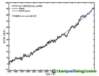 海平面:2019年的海平面依然在持續(xù)上升,全球平均海平面達(dá)到自高精度測(cè)高記錄開始(1993年1月)以來的最高值。據(jù)估算,27年期間的平均上升速度為3.24±0.3毫米/年,冰蓋的冰質(zhì)量損失有所增加是全球平均海平面加速上升的主要原因,而升溫造成的海水膨脹也致使海平面不斷上升。