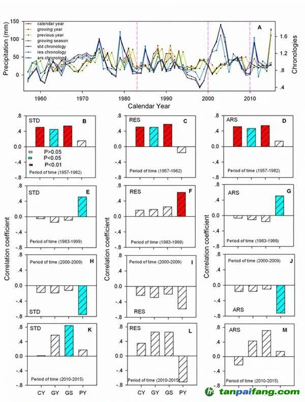 圖2.(A)胡楊樹輪年表對降水的響應(yīng);(B-M)樹輪指數(shù)與降水的相關(guān)系數(shù)(CY-自然年;GY-生長年;GS-生長季;PY-前一生長年)