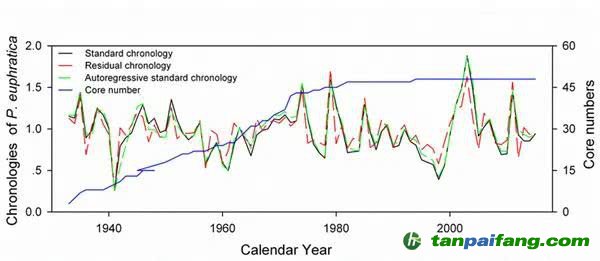 圖1. 塔里木河下游英蘇斷面胡楊樹輪年表 本@文$內(nèi).容.來.自:中`國`碳`排*放^交*易^網(wǎng) t a np ai fan g.c om