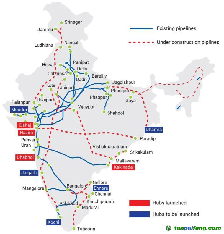 印度石油和天然氣部長(zhǎng) Dharmendra Pradhan提到在未來的幾年內(nèi),印度將把現(xiàn)有的天然氣管網(wǎng)的長(zhǎng)度由17000公里擴(kuò)展到32000公里,將LNG接受能力從目前的每年3920萬噸提升到每年5000萬噸。