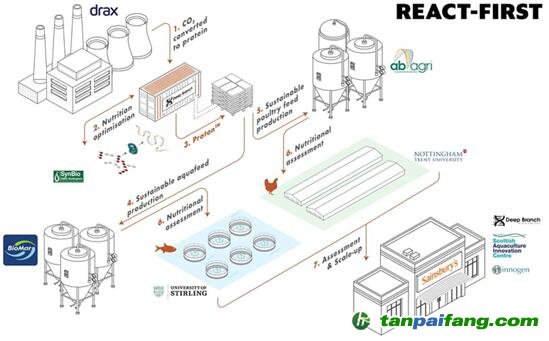 REACT-FIRST項目利用微生物將生物質(zhì)燃燒電廠排放的二氧化碳直接轉(zhuǎn)化為高價值產(chǎn)品,包括一種新型單細胞蛋白質(zhì)(SCP),被碳回收生物技術(shù)公司Deep Branch命名為ProtonTM。Deep Branch首席執(zhí)行官Peter Rowe表示,“該蛋白質(zhì)能夠用于魚和家禽的飼料生產(chǎn),該技術(shù)是一種新型的更可持續(xù)的動物飼料生產(chǎn)工藝。通過REACT-FIRST項目,我們能夠獲得ProtonTM的成本、消化率、營養(yǎng)質(zhì)量和