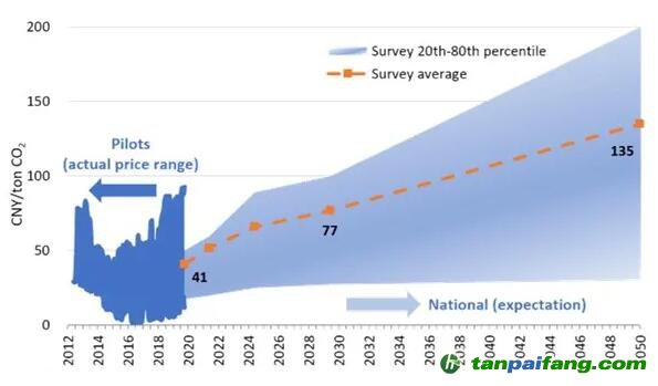 價(jià)格(平均)預(yù)計(jì)將從2020年的49元/噸穩(wěn)步上升,到2030年將達(dá)到93元/噸,并于本世紀(jì)中葉超過167元/噸。考慮到在調(diào)查開展之后中國(guó)做出了將實(shí)現(xiàn)碳中和的承諾,最新的