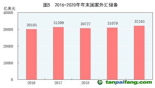 年末國家外匯儲備32165億美元,比上年末增加1086億美元。全年人民幣平均匯率為1美元兌6.8974元人民幣,比上年升值0.02%。