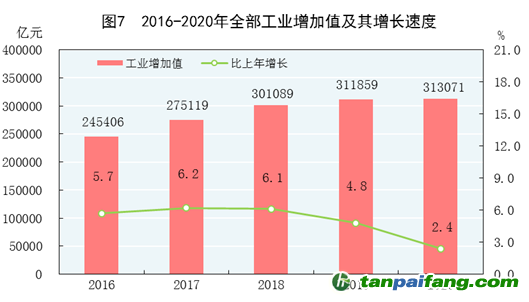 全年全部工業(yè)增加值313071億元,比上年增長2.4%。規(guī)模以上工業(yè)增加值增長2.8%。在規(guī)模以上工業(yè)中,分經(jīng)濟類型看,國有控股企業(yè)增加值增長2.2%;股份制企業(yè)增長3.0%,外商及港澳臺商投資企業(yè)增長2.4%;私營企業(yè)增長3.7%。分門類看,采礦業(yè)增長0.5%,制造業(yè)增長3.4%,電力、熱力、燃氣及水生產(chǎn)和供應業(yè)增長2.0%。