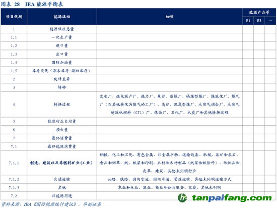 根據(jù)2019年IEA發(fā)布的《國際能源統(tǒng)計建議》,能源平衡表提供了一國領土上能源狀況的全面、統(tǒng)一的數(shù)據(jù)。能源平衡表的每一列表示能源產(chǎn)品,每一行表示能源流動,包括能源的初級生產(chǎn)(反映能源進入/離開國家領土)、能源的轉換(反映能源的轉移、轉換、能源行業(yè)自用和損失)和能源的最終消費(反映能源產(chǎn)品最終能源消費和非能源用途)等三個板塊。轉換板塊和最終消費板塊的具體劃分如圖表28所示。