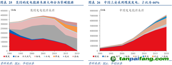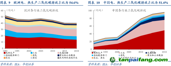電力和熱力生產(chǎn)行業(yè)是全球二氧化碳排放最主要的來源。2019年,全球電力和熱力生產(chǎn)行業(yè)二氧化碳排放量約為140億噸,占比約42%。美國、歐洲和中國的電力和熱力生產(chǎn)行業(yè)二氧化碳排放量分別為18.5億、14.1億噸和49.2億噸,占美國、歐洲和中國二氧化碳排放量之比分別為37.6%、35.3%和51.4%。 禸嫆@唻洎:狆國湠棑倣茭昜蛧 τāńpāīfāńɡ.cōm