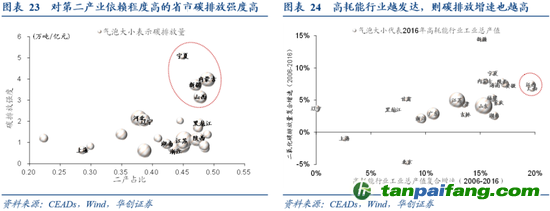 2)高耗能行業(yè)工業(yè)總產(chǎn)值增速越高,則碳排放增速也越高,如圖表24所示。江西和廣西2006-2016的高耗能行業(yè)工業(yè)總產(chǎn)值的年復合增速在22個省市中是最高的,均為20%左右,同時,江西和廣西的二氧化碳排放年復合增速也較高,均為7%左右。新疆二氧化碳排放年復合增速最高,為14%,其高耗能行業(yè)工業(yè)總產(chǎn)值的年復合增速較高,為15%。
