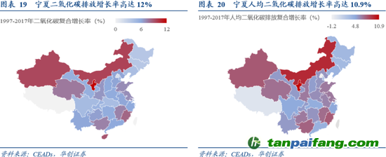 寧夏和內蒙古是二氧化碳、人均二氧化碳年復合增長率最高的兩個省份。2017年,寧夏相對于1997年的二氧化碳、人均二氧化碳年復合增長率分別為12%和10.9%;內蒙古相對于1997年的二氧化碳、人均二氧化碳年復合增長率分別為10%和9.4%。如果單獨要求各省控制碳排放增速,那么寧夏和內蒙古等省市可能受到較大影響。