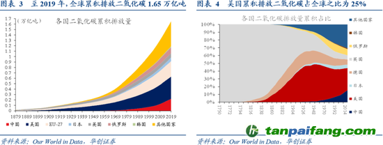 累積來看,從1750-2019年,全球已經(jīng)累積排放了超過1.65萬億噸二氧化碳。其中美國累積排放0.41萬億噸,占全球累積排放的25%;EU-27累積排放0.28萬億噸,占全球累積排放的17.4%;中國累積排放0.22萬億噸,占全球累積排放的13%;俄羅斯累積排放1.1萬億噸,占全球累積排放的6.9%;英國累積排放0.08萬億噸,占全球累積排放的4.7%。從累積排放的角度看,中國并不是二氧化碳排放的最大貢獻者。