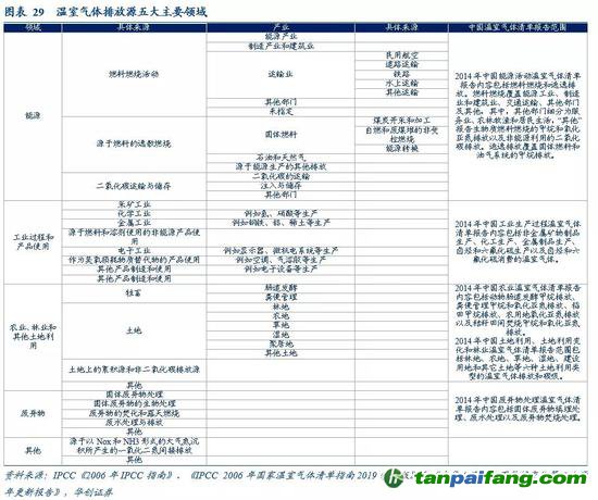 根據(jù)《中華人民共和國氣候變化第三次國家信息通報》,2010年和2014年國家溫室氣體清單范圍均包括能源活動,工業(yè)生產(chǎn)過程,農業(yè)活動,土地利用、土地利用變化和林業(yè),廢棄物處理五個領域的二氧化碳(CO2),甲烷(CH4),氧化亞氮(N2O),氫氟碳化物(HFCs),全氟化碳(PFCs)和六氟化硫(SF6)排放或吸收。編制方法主要遵循《政府間氣候變化專門委員會(IPCC)國家溫室氣體清單編制指南(1996年修訂版)》要求,部分排放源的計算遵循《2006年IPCC國家溫室氣體清單指南》要求,具體如圖表29所示。 本文`內-容-來-自;中_國_碳_交^易=網(wǎng) tan pa i fa ng . c om
