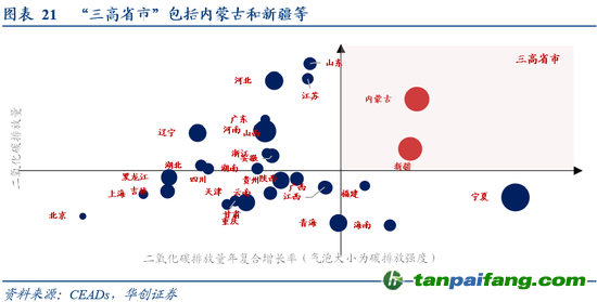 內蒙古和新疆承接較多高耗能行業(yè),可能會受到影響。根據(jù)2020年內蒙古人民政府發(fā)布的《內蒙古自治區(qū)生態(tài)環(huán)境廳關于部分省區(qū)控制溫室氣體排放目標責任落實情況座談會精神和下一步工作措施意見建議的報告》,內蒙古自治區(qū)落實政策要求,參與全國產(chǎn)業(yè)布局分工,承接了一批高水平煤電、現(xiàn)代煤化工、鋼鐵、電解鋁等項目,客觀上造成碳排放剛性增長。同時,一批煤化工、電解鋁、鐵合金等項目投產(chǎn),使得能源消費需求剛性增加,推動碳排放量過快增長。