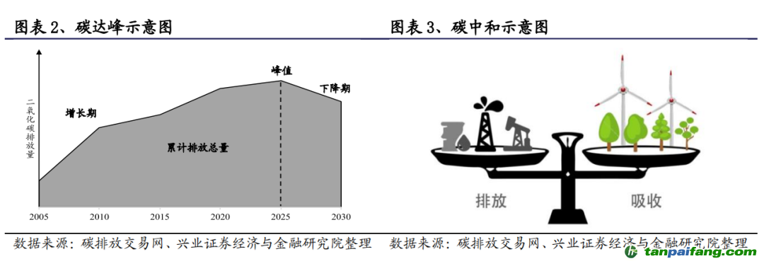 碳達峰是實現(xiàn)碳中和的前提條件,盡早地實現(xiàn)碳達峰可促進碳中和的早日實現(xiàn)。據此,結合我國的承諾的時間節(jié)點:1)從現(xiàn)在至 2030 年,我國的碳排放仍將處于一個爬坡期;2)2030-2060 年這 20 年間,碳排放要渡過平臺期并最終完成減排任務。 本*文`內/容/來/自:中-國-碳^排-放“交|易^網-tan pai fang . c o m