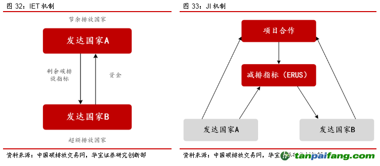 ? 聯(lián)合履行機(jī)制(JI):發(fā)達(dá)國(guó)家之間通過(guò)項(xiàng)目級(jí)的合作,其所實(shí)現(xiàn)的減排單位(簡(jiǎn)稱“ERU”),可以轉(zhuǎn)讓給另一發(fā)達(dá)國(guó)家締約方,但是同時(shí)必須在轉(zhuǎn)讓方的分配額上扣減相應(yīng)的額度。