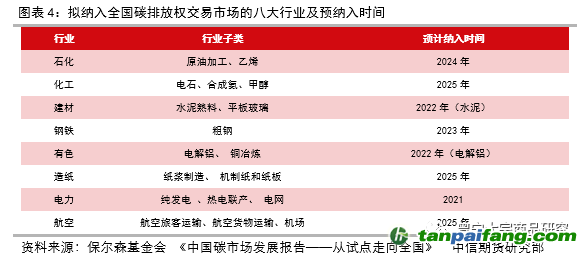 2016年發(fā)改委發(fā)布的《關(guān)于進(jìn)一步規(guī)范報(bào)送全國碳排放權(quán)交易市場擬納入企業(yè)名單的通知》,確定了石化、化工、建材、鋼鐵、有色、造紙、電力和航空等八個(gè)擬納入全國碳排放權(quán)交易市場的高碳排放企業(yè)。由于在數(shù)據(jù)基礎(chǔ)成熟度與碳減排的難易程度不同,因此被納入的順序?qū)⒂兴顒e。隨著全國碳排放權(quán)交易市場正式開啟,電力行業(yè)首批納入,市場化減排進(jìn)入新的加速階段,預(yù)計(jì)很快將陸續(xù)覆蓋更多行業(yè)。