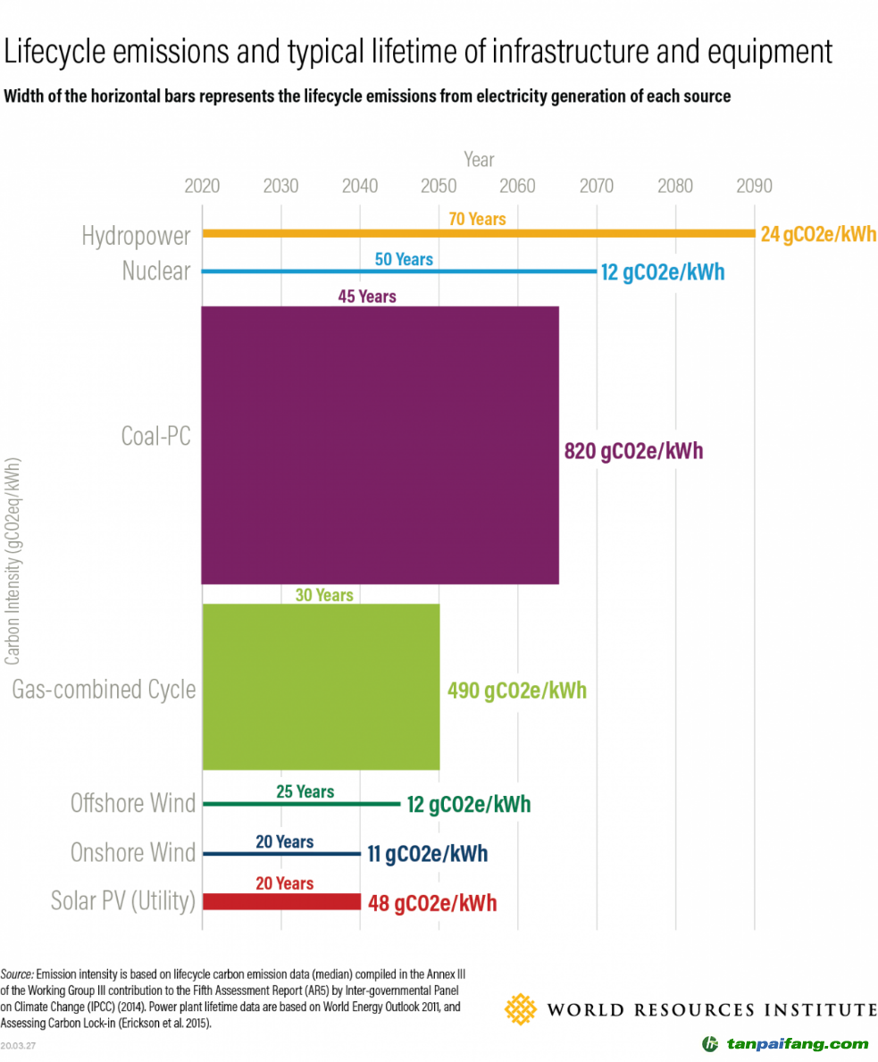 從現(xiàn)在到2030年,全球范圍內(nèi)預計將有近90萬億美元地資金被投資于基礎設施。能否用好這筆資金,對于全球應對氣候變化、實現(xiàn)可持續(xù)發(fā)展十分關鍵。假設一家電力公司需要建設新的發(fā)電廠以滿足不斷增長的電力需求,那么最終投建的電廠類型將帶來截然不同的排放結(jié)果。如下圖所示,即便假設每個發(fā)電廠每年在其各自的生命周期內(nèi)能提供相同數(shù)量的電力,不同類型的發(fā)電廠所帶來的排放量也有顯著差異。以單位發(fā)電量產(chǎn)生的溫室氣體排放為例,一座預期使用壽命為50年的核電站,每千瓦時僅產(chǎn)生 12克溫室氣體 排放(gCO2e/kWh),而一座預期使用壽命為45年的化石燃煤電廠將產(chǎn)生前者68倍的溫室氣體排放 (820 gCO2e/kWh)。同樣,一座使用壽命為30年的天然氣聯(lián)合循環(huán)發(fā)電廠的排放量 (490 gCO2e/kWh) 是一座壽命為25年的海上風電設施的40倍以上 (12 gCO2e/kWh)。