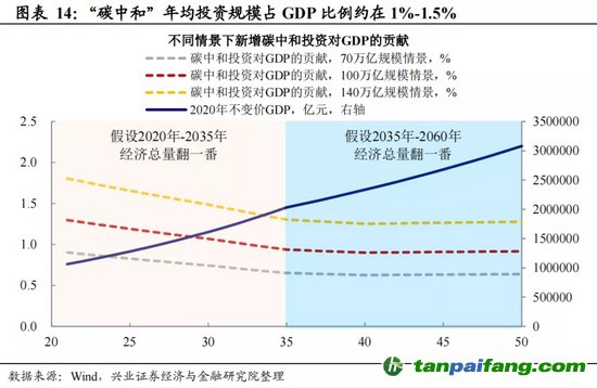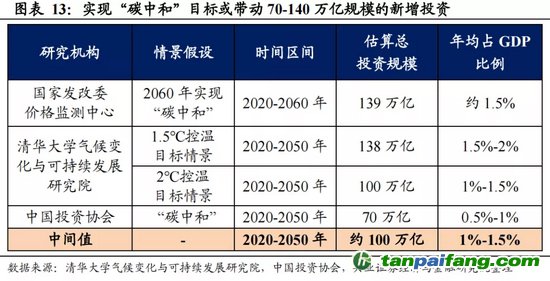 估算顯示實現(xiàn)“雙碳”目標(biāo)過程中年均投資規(guī)模約占GDP的1%-1.5%。清華大學(xué)研究報告顯示,至2050年為止,實現(xiàn)1.5攝氏度溫控目標(biāo)所需新增投資大概是138萬億元,實現(xiàn)2攝氏度溫控目標(biāo)所需新增投資大概是100萬億元。國家發(fā)改委價格監(jiān)測中心研究人員稱,2060年前實現(xiàn)‘碳中和’,所需投資將超過139萬億元。中國投資協(xié)會測算顯示,實現(xiàn)“碳中和”目標(biāo),所需投資大約為70萬億元。根據(jù)上述研究機構(gòu)的測算取中間值,“碳中和”投資規(guī)模可能在100萬億左右,年均投資規(guī)模約占GDP的1%-1.5%左右。(詳見2021年3月3日報告《“碳中和”能否驅(qū)動新一輪投資率上行?》) 夲呅內(nèi)傛萊源?。骇鎲┨?排*放^鮫*易-網(wǎng) τā ńpāīfāńɡ.cōm