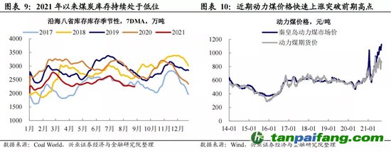 從國內(nèi)情況看,煤炭價格的上升或也會使電價有上漲壓力。自供給側(cè)改革以來,煤炭行業(yè)供需持續(xù)處于緊平衡狀態(tài)。2020年年底以來,隨著“碳達(dá)峰、碳中和”持續(xù)推進,環(huán)保不達(dá)標(biāo)的煤礦關(guān)停等措施影響煤炭供給有所收縮,煤炭供需緊平衡狀態(tài)趨強,煤炭庫存今年以來持續(xù)低于季節(jié)性水平,動力煤價格自去年年底以來走出上漲趨勢,并于今年年初突破1000元/噸,近期動力煤價格再次突破前期高點。