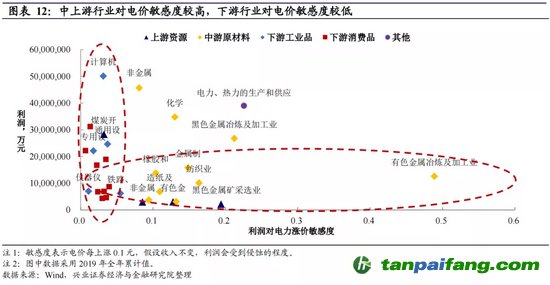 如果電價上漲,下游行業(yè)相對不敏感,而中上游較敏感。從不同類型的行業(yè)對電價的敏感度來看,電價每漲價0.1元,假設(shè)收入和其他成本不變,大部分下游消費品和工業(yè)品對利潤的影響不到5%。然而中上游行業(yè)利潤相對會受到較大的影響,在收入不變的情況下,利潤可能會受到10%-20%的侵蝕。因此,如果電價上漲,中上游行業(yè)的利潤可能會對電價上漲更加敏感。 禸嫆@唻洎:狆國湠棑倣茭昜蛧 τāńpāīfāńɡ.cōm