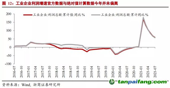 正是由于多項(xiàng)政策定向支持中小企業(yè)及民營(yíng)經(jīng)濟(jì),今年以來(lái)雖然上游大宗商品價(jià)格持續(xù)攀升,我們卻并未看到明顯的中下游行業(yè)出清。除微觀調(diào)研獲取信息外,宏觀層面觀察工業(yè)企業(yè)出清的一種方式是通過(guò)比較工業(yè)企業(yè)利潤(rùn)的官方公布同比增速及使用絕對(duì)值計(jì)算同比增速的相互走勢(shì),由于我國(guó)工業(yè)統(tǒng)計(jì)制度僅統(tǒng)計(jì)規(guī)模以上企業(yè)數(shù)據(jù),樣本每年一大調(diào)、每月也會(huì)有小調(diào),若出現(xiàn)了中下游企業(yè)的行業(yè)出清,則行業(yè)集中度提高、利潤(rùn)會(huì)向頭部規(guī)模以上企業(yè)集中,官方公布數(shù)據(jù)已考慮樣本更新,其數(shù)值會(huì)相較絕對(duì)值直接計(jì)算的增速更高,典型時(shí)期如供給側(cè)結(jié)構(gòu)性改革期間,受去產(chǎn)能影響,上游原材料價(jià)格大幅上漲沖擊中下游企業(yè)經(jīng)營(yíng),導(dǎo)致部分小企業(yè)倒閉退出市場(chǎng),帶來(lái)2017年末至2019年上半年兩項(xiàng)數(shù)據(jù)的大幅偏離。但這種情況在去年及今年均未出現(xiàn),得益于政策保市場(chǎng)主體、對(duì)中小企業(yè)的定向支持,中小企業(yè)經(jīng)營(yíng)得以穩(wěn)定于盈虧平衡線附近,未出現(xiàn)倒閉出清。 禸嫆@唻洎:狆國(guó)湠棑倣茭昜蛧 τāńpāīfāńɡ.cōm