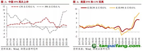 經(jīng)濟(jì)回落的同時(shí),全球通脹壓力持續(xù)上升,能耗雙控或進(jìn)一步推升全球滯脹壓力,而且美國(guó)通脹壓力更加突出。數(shù)據(jù)顯示,我國(guó)8月PPI同比已達(dá)到9.5%的高位,不過(guò)CPI同比只有0.8%,通脹還沒(méi)有全面向居民消費(fèi)端傳遞;而美國(guó)是PPI和CPI雙高,其CPI已經(jīng)連續(xù)4個(gè)月位于5%以上的高位,通脹壓力更大。 本+文+內(nèi)/容/來(lái)/自:中-國(guó)-碳-排-放(交—易^網(wǎng)-tan pai fang . com