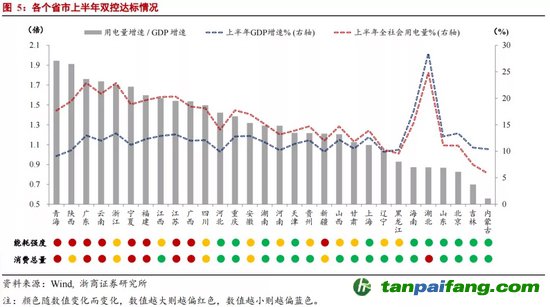 上半年雙控未達(dá)標(biāo)省份下半年推進(jìn)壓力較大。8月12日,發(fā)改辦環(huán)資〔2021〕629號(hào)文《2021年上半年各地區(qū)能耗雙控目標(biāo)完成情況晴雨表》,明確表示,自本通知印發(fā)之日起,對(duì)能耗強(qiáng)度不降反升的地區(qū),2021年暫停“兩高”項(xiàng)目節(jié)能審查(國(guó)家規(guī)劃布局的重大項(xiàng)目除外)。并做出要求,各地要堅(jiān)決貫徹落實(shí)黨中央、國(guó)務(wù)院決策部署,對(duì)上半年嚴(yán)峻的節(jié)能形勢(shì)保持高度警醒,采取有力措施,確保完成全年能耗雙控目標(biāo)特別是能耗強(qiáng)度降低目標(biāo)任務(wù)。9月11日,發(fā)改環(huán)資〔2021〕1310號(hào)印發(fā)《完善能源消費(fèi)強(qiáng)度和總量雙控制度方案》,要求健全能耗管理制度,推動(dòng)地方實(shí)施用能預(yù)算管理,嚴(yán)格實(shí)施節(jié)能審查制度,完善能耗雙控考核制度,其中對(duì)于能耗雙控進(jìn)度嚴(yán)重滯后、工作不力的地區(qū)要進(jìn)行問(wèn)責(zé)處理。結(jié)合上半年達(dá)標(biāo)情況來(lái)看,青海、廣東、云南、寧夏、福建、江蘇、廣西等省份在能耗強(qiáng)度和消費(fèi)總量?jī)煞矫婢催_(dá)標(biāo),決策層對(duì)能耗雙控達(dá)標(biāo)的決心堅(jiān)定;考慮四季度冬季用電、供暖等能源需求較大,我們認(rèn)為未達(dá)標(biāo)省份下半年推進(jìn)壓力較大。