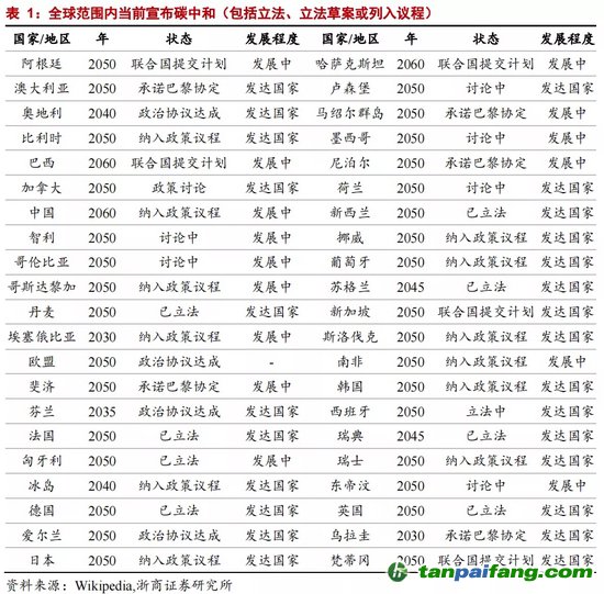 碳中和已成為全球普遍關(guān)注的重要變革領(lǐng)域。根據(jù)統(tǒng)計(jì),當(dāng)前全球范圍內(nèi)已有6個(gè)國(guó)家通過(guò)立法方式明確將在2050年前實(shí)現(xiàn)碳中和,包括英國(guó)、法國(guó)、丹麥、瑞典、新西蘭和匈牙利;6個(gè)國(guó)家(地區(qū))已提出立法草案,分別為歐盟、加拿大、韓國(guó)、西班牙、智利以及斐濟(jì);此外,還有14個(gè)國(guó)家將碳中和納入政策議事日程,包括中國(guó)。