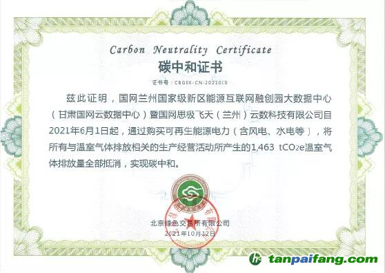 碳排放量全部抵消,標志著甘肅國網(wǎng)云數(shù)據(jù)中心能耗實現(xiàn)100%可再生能源,成為西北區(qū)域及國家電網(wǎng)有限公司首個通過