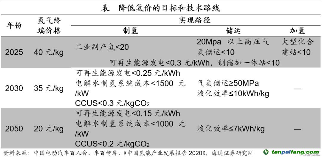 其次,在當(dāng)前技術(shù)條件下,我國(guó)氫能終端消費(fèi)價(jià)格高于其他能源,要推廣氫能的使用,就要實(shí)現(xiàn)綠氫平價(jià)。中國(guó)氫能聯(lián)盟專家委員會(huì)主任余卓平分析,如果到2025年我國(guó)風(fēng)電、光伏的新增裝機(jī)發(fā)電成本降低到0.3元/千瓦時(shí),綠氫成本將降到約25元/千克,能夠與天然氣制氫進(jìn)行競(jìng)爭(zhēng)。等2030年可再生能源發(fā)電成本降低到0.2元/千瓦時(shí)后,綠氫成本將低至15元/千克,可以與現(xiàn)在化石能源加上碳捕集技術(shù)制氫的價(jià)格進(jìn)行競(jìng)爭(zhēng)?!吨袊?guó)氫能產(chǎn)業(yè)發(fā)展報(bào)告2020》則給出了到2025、2030和2050年降低氫價(jià)至40、35、20元/千克的實(shí)現(xiàn)路徑表,可以看出,要使得氫能終端價(jià)格有所降低,需要依靠上游制氫、儲(chǔ)運(yùn)、加氫多環(huán)節(jié)的整合。 禸*嫆唻@洎:狆國(guó)湠棑倣茭昜蛧 τāńpāīfāńɡ.cōm