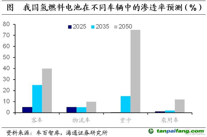 氫燃料電池在交通運(yùn)輸行業(yè)中的應(yīng)用是未來的重要增長(zhǎng)點(diǎn)。目前我國(guó)燃料電池汽車占新能源汽車銷量的比重最高也不超過0.4%。其中,截至2020年8月,燃料電池車主要以物流車和客車為主,乘用車占比僅為0.1%,且主要用于租賃。根據(jù)車百智庫(kù)的預(yù)測(cè),氫燃料電池汽車保有量將在2025、2035和2050年分別達(dá)到10萬、100萬和3000萬輛,年均增速約為25.6%,主要應(yīng)用于重卡、客車等大型車輛中,在乘用車中的滲透率也將提高到12%。