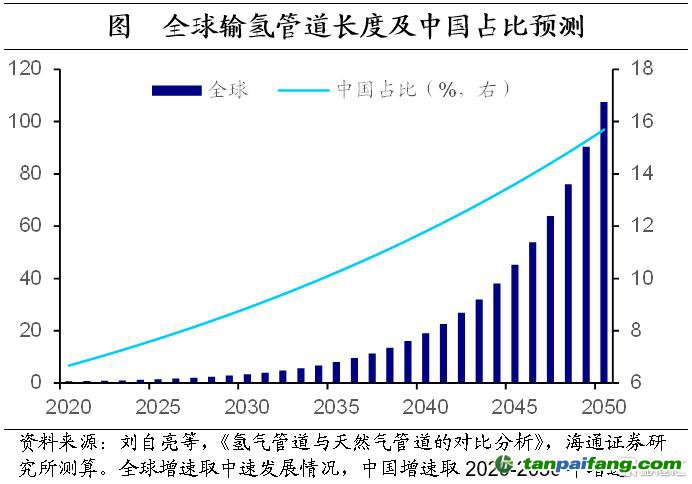 在儲(chǔ)運(yùn)的基礎(chǔ)設(shè)施上,氫氣管網(wǎng)建設(shè)有較大的發(fā)展空間。工業(yè)氫氣運(yùn)輸主要以管道形式為主,低壓管道運(yùn)氫適合大規(guī)模、長(zhǎng)距離的情況,在未來有極大的需求。全球在2020年共建成輸氫管道6000公里,其中,中國(guó)僅有400公里,占比為6.7%。而根據(jù)劉自亮等的研究,預(yù)計(jì)在中速發(fā)展的情況下,到2050年全球?qū)⒔ǔ砷L(zhǎng)距離和短距離輸氫管道7.5萬和100萬公里,年均增速約為18.9%。中國(guó)預(yù)計(jì)到2030年將建成氫氣管道3000公里,年均增速為22.3%,較全球增長(zhǎng)更快。