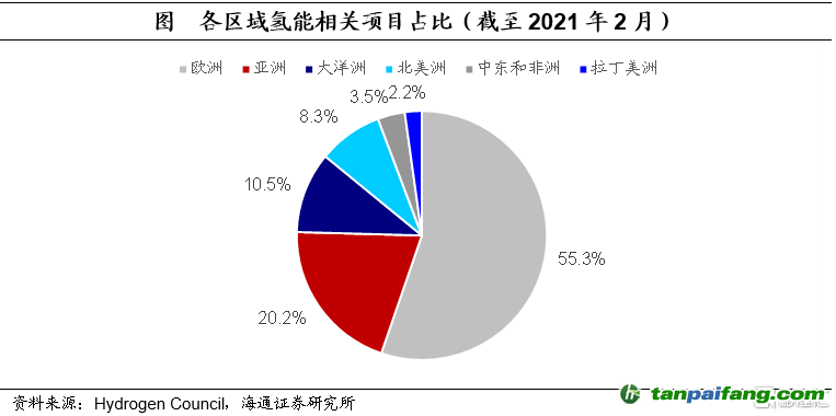 目前我國(guó)也是全球發(fā)展氫能速度較快的國(guó)家之一,在截至2021年初全球投資的氫能項(xiàng)目中,我國(guó)占比較高。據(jù)國(guó)際氫能協(xié)會(huì)統(tǒng)計(jì),全球氫能產(chǎn)業(yè)鏈上已建成、在建和規(guī)劃項(xiàng)目共228個(gè),主要分布在歐洲、澳大利亞、亞洲、中東、智利等國(guó)家和地區(qū)。從地域分布來看,預(yù)計(jì)歐洲的投資份額最大(約45%),其次是亞洲,而中國(guó)占亞洲總投資的50%左右,居首位。 本文@內(nèi)/容/來/自:中-國(guó)-碳^排-放-交易&*網(wǎng)-tan pai fang . com