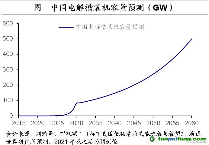 具體地,我們按產(chǎn)業(yè)鏈的上中下游分別尋找未來的焦點(diǎn)賽道。從生產(chǎn)端看,核心在于如何低成本制取零碳排放的綠氫,與此相關(guān)的賽道包括電解槽、催化劑、碳捕集和封存(CCUS)等。其中,可以從低碳電力和水中產(chǎn)生干凈的氫氣,是未來增加綠氫供給的核心。近年來我國(guó)電解制氫項(xiàng)目及裝機(jī)容量增速較快,從2015年的1.63MW,增至2020年的23.47MW,年均增速高達(dá)70.5%。要實(shí)現(xiàn)到2030年和2060年綠氫占比達(dá)13.5%和76.9%的目標(biāo),分別需要部署電解槽裝機(jī)80GW和500GW,這意味著在2020-2030年間要保持年均125.6%的超高增速,而在2030年后,年增速逐步趨于正常。