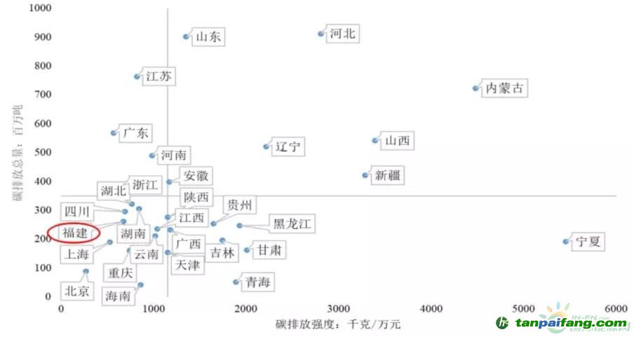 ◆總量差異:河北、山東、江蘇、內(nèi)蒙古、廣東排名前五,排放總量全部超過(guò)5億噸,產(chǎn)業(yè)結(jié)構(gòu)偏重、能源結(jié)構(gòu)偏煤,為域外提供大量高載能產(chǎn)品;福建全國(guó)排名16,排放總量為2.61億噸、低于全國(guó)平均水平。 本文@內(nèi)/容/來(lái)/自:中-國(guó)-碳^排-放-交易&*網(wǎng)-tan pai fang . com