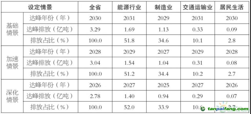 ◆在基礎(chǔ)情景下,全省與全國(guó)同步達(dá)峰,但能源行業(yè)、交通運(yùn)輸業(yè)要比全國(guó)晚1年達(dá)峰,制造業(yè)早1年達(dá)峰; 禸*嫆唻@洎:狆國(guó)湠棑倣茭昜蛧 τāńpāīfāńɡ.cōm