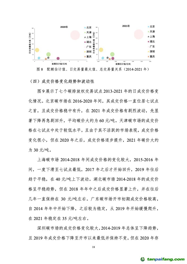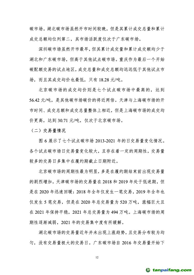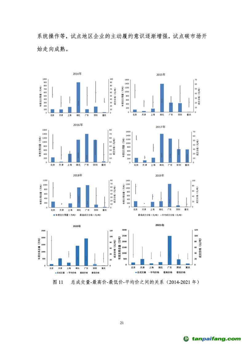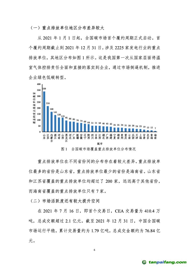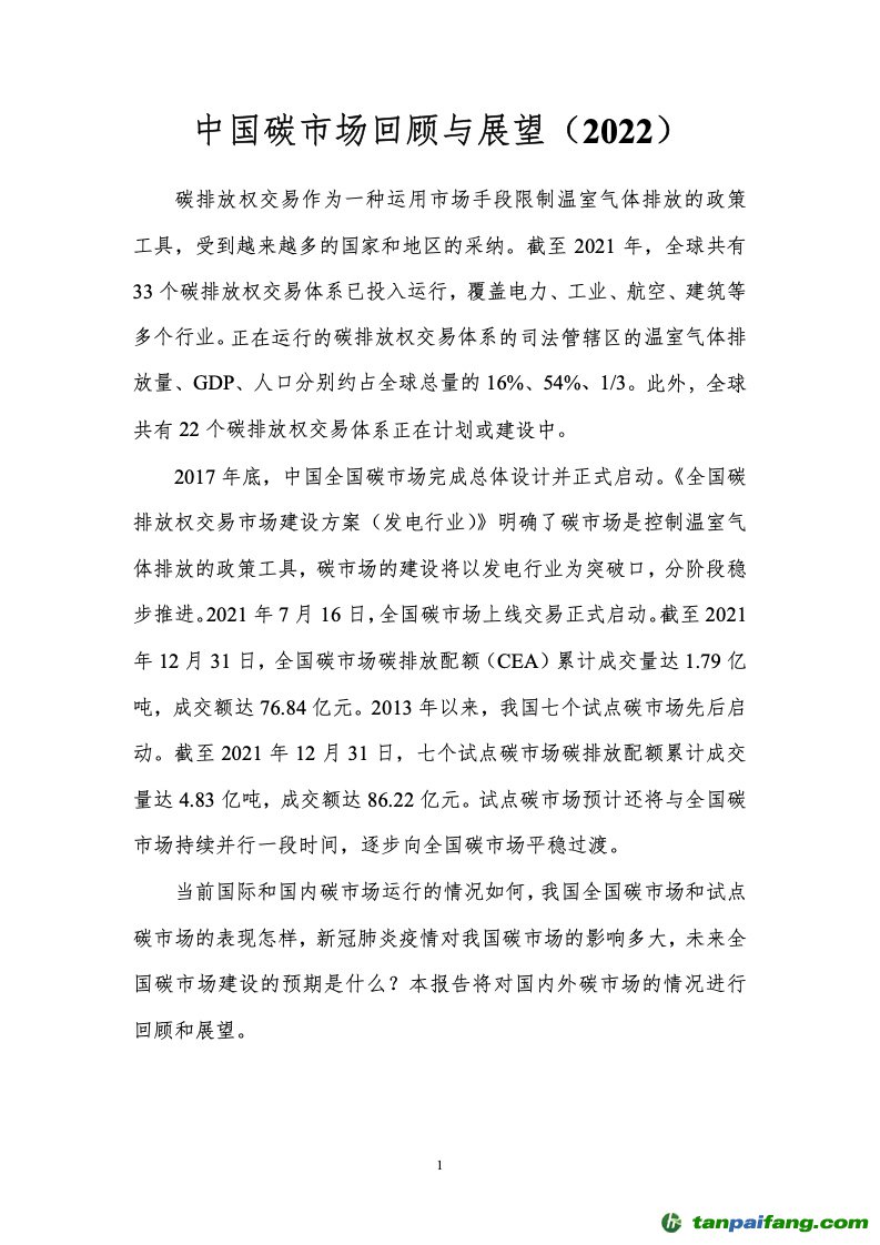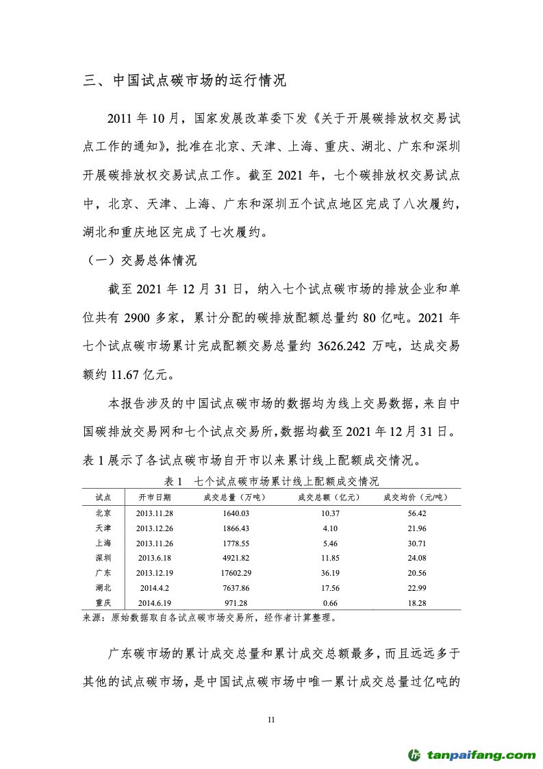 《中國(guó)碳市場(chǎng)回顧與展望(2022)》指出,目前全國(guó)碳市場(chǎng)整體運(yùn)行平穩(wěn),截至2021年年底,全國(guó)碳市場(chǎng)碳排放配額(CEA)累計(jì)成交量達(dá)1.79億噸,成交額達(dá)76.84億元。北京、天津、上海、重慶等七個(gè)試點(diǎn)碳市場(chǎng)碳排放配額累計(jì)成交量達(dá)4.83億噸,成交額達(dá)86.22億元。試點(diǎn)碳市場(chǎng)預(yù)計(jì)還將與全國(guó)碳市場(chǎng)持續(xù)并行一段時(shí)間,逐步向全國(guó)碳市場(chǎng)平穩(wěn)過(guò)渡。 本`文內(nèi).容.來(lái).自:中`國(guó)`碳`排*放*交*易^網(wǎng) t a npai fan g.com