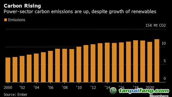 根據(jù)Ember的分析,2021年電力行業(yè)碳排放量較2020年增長(zhǎng)7%,為2010年以來(lái)最大增幅,較新冠疫情前水平高出3%。這一趨勢(shì)今年可能會(huì)繼續(xù)下去,因?yàn)樵谔烊粴?a href='http://www.avav2727.com/tanhangqing' target='_blank'>價(jià)格高企的情況下,各國(guó)都轉(zhuǎn)向了碳排放量最多的化石燃料煤炭。