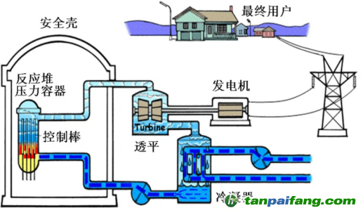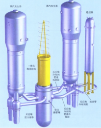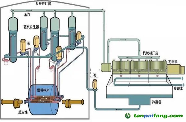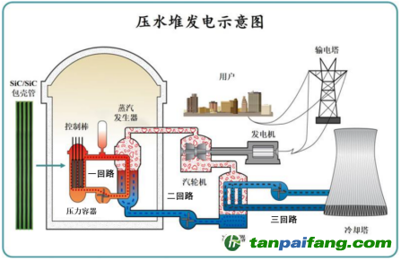壓水堆是使用加壓的輕水(提高沸點)做冷卻劑和慢化劑的反應(yīng)堆,采用富集度3%~5%的鈾做核燃料。壓水堆分為三個回路,一回路的作用是利用高壓水帶走堆內(nèi)熱量。二回路的作用是接收一回路高壓水傳遞出的熱量,并將其用來發(fā)電,三回路是用來將二回路發(fā)電后的余熱排放到環(huán)境(江、河、湖、海或大氣)。