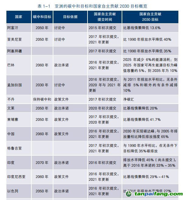 報(bào)告中提到,在亞洲七大經(jīng)濟(jì)體(中國、日本、印度、韓國、印度尼西亞、沙特阿拉伯和土耳其)中,日本和韓國已經(jīng)確定于2050年實(shí)現(xiàn)碳中和目標(biāo),土耳其為2053年,中國、印度尼西亞和沙特阿拉伯為2060年,印度為2070年。各國的2030年國家自主貢獻(xiàn)目標(biāo),有些是在相對(duì)于歷史水平或基線情景(即假設(shè)“照常營業(yè)(BAU)”情景)下的