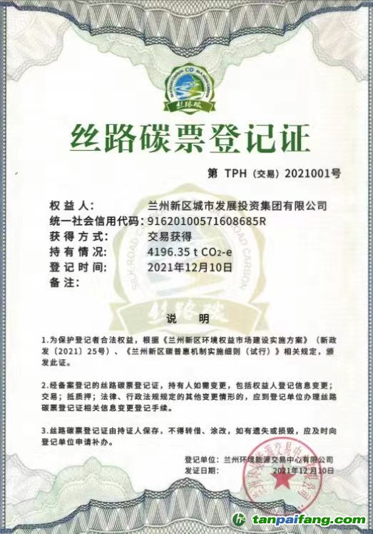 絲路碳票登記證(受訪者供圖) 本`文@內(nèi)-容-來-自;中_國_碳排0放_交-易=網(wǎng) t an pa ifa ng . c om