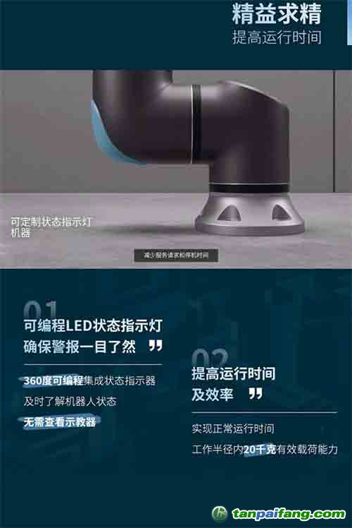 經(jīng)過風(fēng)險評估,ur機器人是不必設(shè)置安全圍欄的,旁邊協(xié)同工作的員工不用擔心會有危險,而且URe系列協(xié)作機械臂表面光滑,關(guān)節(jié)處無尖角,這樣就避免了員工在操作時可能出現(xiàn)的傷害,在經(jīng)過德國技術(shù)檢驗協(xié)會的安全認證后,隨即投入市場。6月新發(fā)布的UR20可編程LED狀態(tài)指示燈釋放警報信號,無需查看示教器,就可以將機器人狀態(tài)一目了然,提高工作場所安全性。