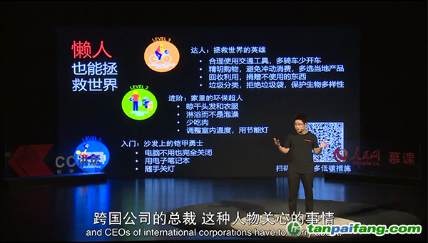 在每一次演講的結(jié)尾,魏科都會認真地想觀眾們介紹以下的具體措施:比如說隨手關(guān)燈、隨手關(guān)電器這些入門級的,或者在家里把泡澡改成淋浴、把吹干頭發(fā)換成擦干頭發(fā)、把烘衣服換成晾衣服,或者我們可以更多地選擇合理的交通方式、更多的運動、更多的騎行、精明地購物、避免買買買的沖動、避免消費陷阱,或者我們可以回收各種資源品、捐贈我們不使用的物品、做好垃圾分類、拒絕(一次性)垃圾袋。