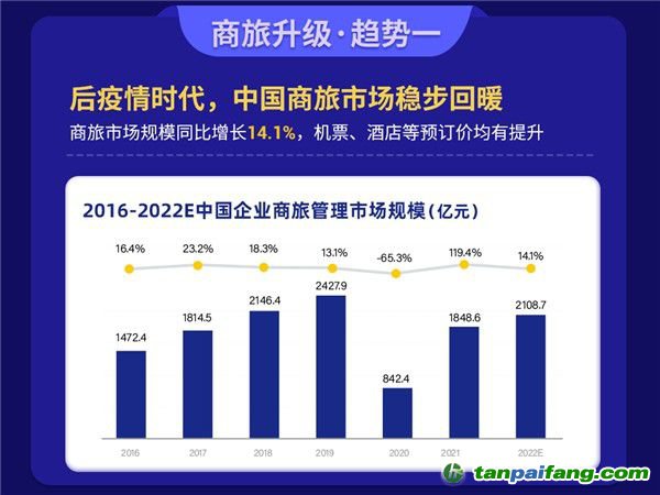 《白皮書》數(shù)據(jù)顯示,疫情對中國商旅市場影響明顯,但隨著國內(nèi)經(jīng)濟(jì)穩(wěn)定復(fù)蘇以及國內(nèi)疫情基本得到有效控制,預(yù)計(jì)2022年中國商旅管理市場在2021年的基礎(chǔ)上繼續(xù)回暖,市場規(guī)模預(yù)計(jì)達(dá)2108.7億元,同比增長14.1%。 禸嫆@唻洎:狆國湠棑倣茭昜蛧 τāńpāīfāńɡ.cōm