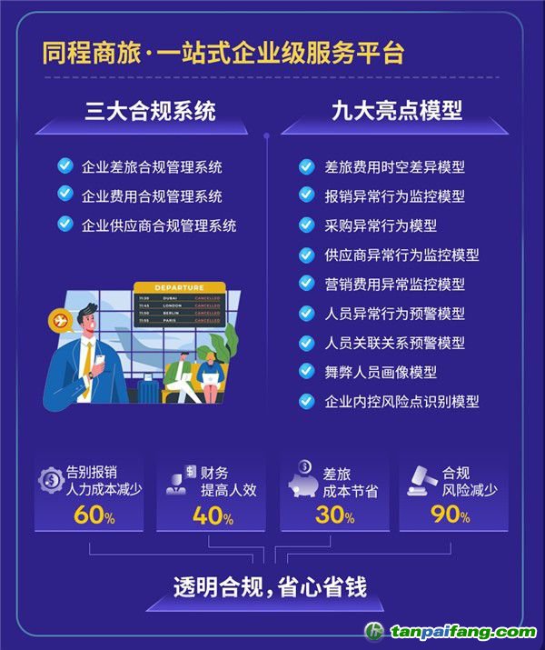 同程商旅以整合企業(yè)差旅、費(fèi)控、OA系統(tǒng)、支付、報(bào)銷為一體,可為企業(yè)提供商旅服務(wù)新標(biāo)準(zhǔn),助力企業(yè)實(shí)現(xiàn)消費(fèi)支出合規(guī)透明、降本增效,提升員工滿意度。數(shù)據(jù)顯示,同程商旅通過數(shù)智化管理手段為企業(yè)差旅成本優(yōu)化30%,告別線下報(bào)銷流程后財(cái)務(wù)人效提高40%,進(jìn)行合規(guī)管控后企業(yè)風(fēng)險(xiǎn)減少90%。此外,同程商旅不僅對企業(yè)管理所需的基本功能做了全面深度覆蓋,還通過獨(dú)有的特色數(shù)智化合規(guī)平臺(tái)為行業(yè)提供新的服務(wù)模式,最終為企業(yè)前置識(shí)別不合規(guī)行為,做到有效預(yù)警、規(guī)避風(fēng)險(xiǎn)。