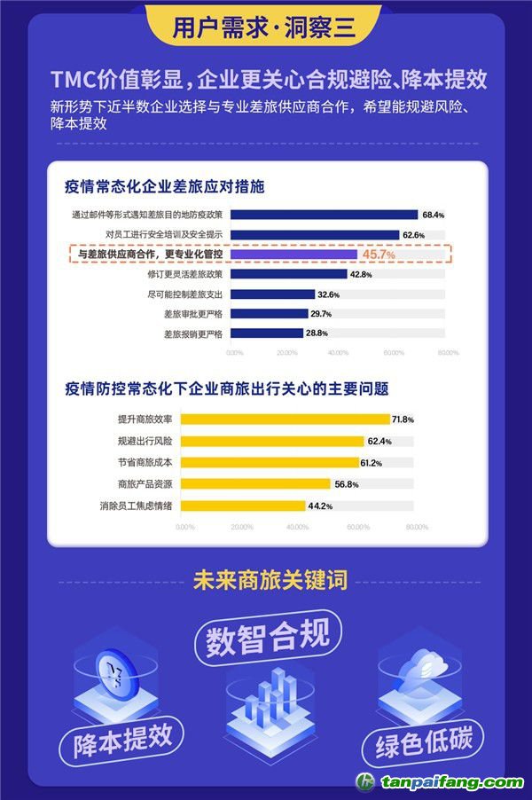 《白皮書》認(rèn)為,商旅管理已不再只是基礎(chǔ)的商旅資源管理,更是發(fā)展成為融合商旅業(yè)務(wù)執(zhí)行、費(fèi)用控制、成本控制、數(shù)據(jù)分析等功能于一體的智能化、自動(dòng)化、定制化、標(biāo)準(zhǔn)化的一站式數(shù)字化管理平臺(tái),數(shù)字化管理將和商旅管理高效協(xié)同。在后疫情時(shí)代,企業(yè)差旅費(fèi)控意識(shí)將得到普及,而代表著專業(yè)、全鏈路服務(wù)的數(shù)字賦能已成為重要一環(huán)。 本*文@內(nèi)-容-來-自;中_國_碳^排-放*交-易^網(wǎng) t an pa i fa ng . c om