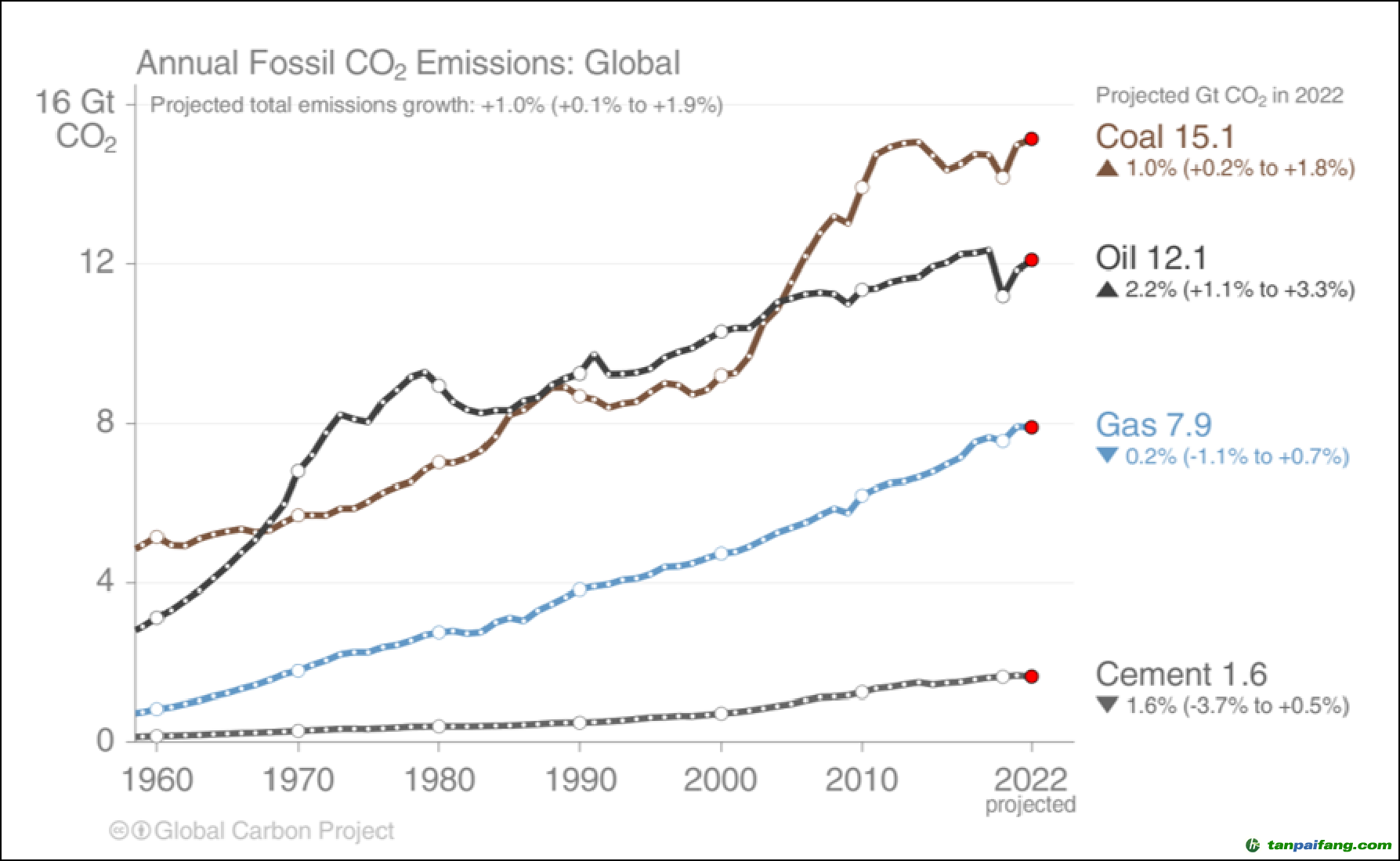 根據(jù)GCP網(wǎng)站11月11日發(fā)布的《2022年全球碳預(yù)算》報告,在2022年,全球碳排放量將增加至約366億噸,相較去年增加1%,而且略高于2019年的水平。其中,約90%排放量來自煤炭、石油和天然氣的使用。