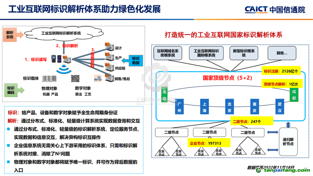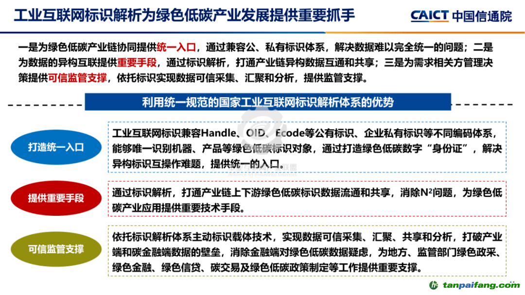 3.工業(yè)互聯(lián)網(wǎng)標識解析賦能綠色低碳高質(zhì)量發(fā)展。標識解析體系為產(chǎn)業(yè)鏈價值鏈協(xié)同共享提供重要入口,一是通過兼容公、私有標識體系,解決數(shù)據(jù)難以完全統(tǒng)一的問題;二是為數(shù)據(jù)的異構(gòu)互聯(lián)提供重要手段,打通產(chǎn)業(yè)鏈異構(gòu)數(shù)據(jù)互通和共享;三是依托標識實現(xiàn)數(shù)據(jù)可信采集、匯聚和分析,提供監(jiān)管支撐。 本`文@內(nèi)/容/來/自:中-國^碳-排-放^*交*易^網(wǎng)-tan pai fang. com