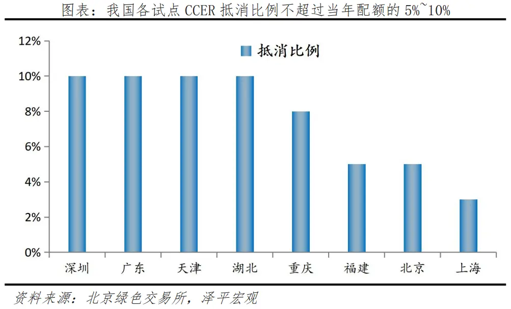 直到2017年,為規(guī)范施行辦法中存在的溫室氣體自愿減排交易量小、個(gè)別項(xiàng)目不夠規(guī)范的問題,CCER項(xiàng)目備案暫停受理,但存量的CCER交易仍在各大試點(diǎn)進(jìn)行。自愿減排市場試點(diǎn)以來,總體上CCER抵消的碳排放量一般不超過當(dāng)年配額總量的5%-10%。