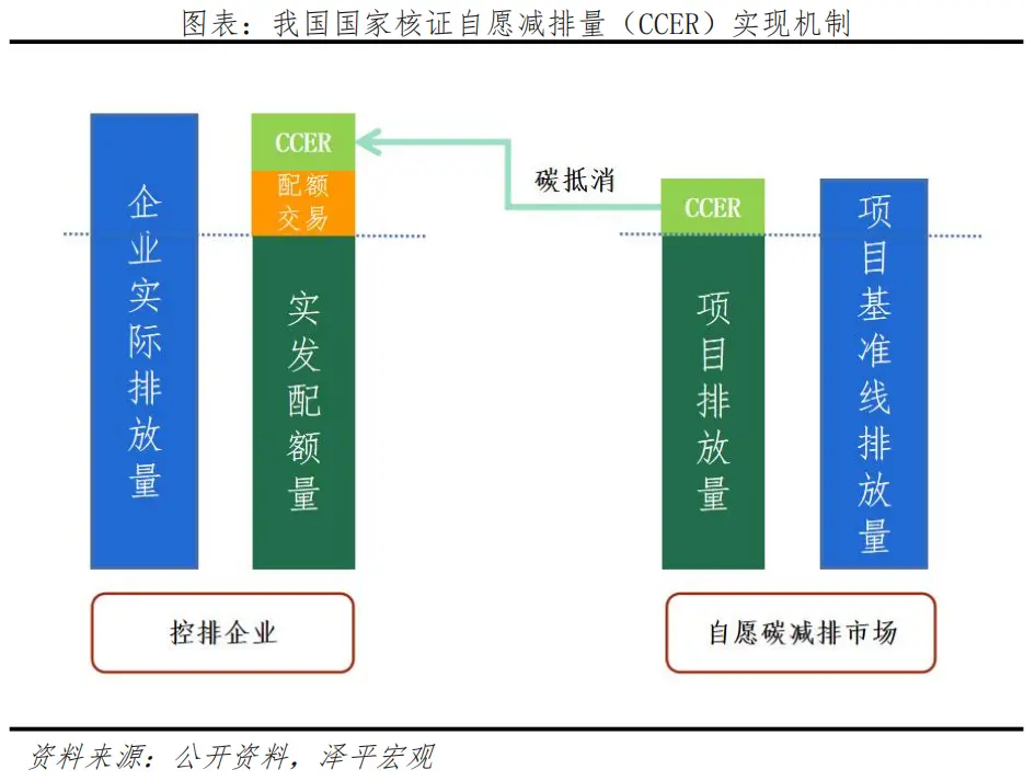 2012年之后,我國CDM項(xiàng)目的主要客戶——歐盟碳市場——需求持續(xù)下降,無法消納持續(xù)增加的核證碳減排項(xiàng)目所產(chǎn)生的減排量。于是,在借鑒CDM的基礎(chǔ)上,我國開始發(fā)展中國的自愿減排市場。在自愿碳減排市場,企業(yè)的項(xiàng)目中,不足基準(zhǔn)線排放量的部分可申請(qǐng)成為國家核證自愿減排量。隨后可通過交易機(jī)制向控排企業(yè)出售,實(shí)現(xiàn)控排企業(yè)的碳抵消。