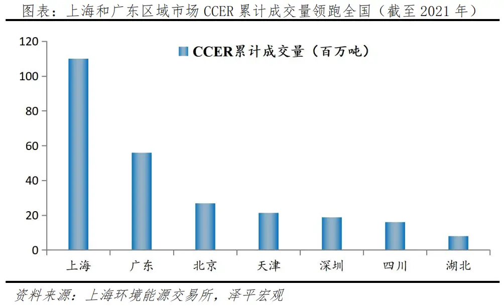 在成交量方面,上海和廣東區(qū)域市場領(lǐng)跑全國。至2021年末,我國9家交易中心CCER累計(jì)交易量達(dá)到2.68億噸,其中上海市場CCER累計(jì)成交量為1.1億噸,占比41%;廣東市場成交量超過5600萬噸,占比21%,北京、深圳、四川、福建和天津的CCER累計(jì)成交量在1000-3000萬噸之間,分別占比在4%-10%。